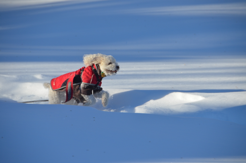 Snow dog Romeo on a romp! (Read more about Romeo)