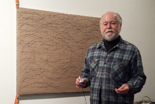 One wall in the basement was bare but for a large piece of light brown paper sporting some black lines – a work in progress. Rose picked up a black marker that was connected by wire to a CD recorder. As he drew on the paper, sounds emanated from speakers – something like ocean waves – what he called “a real onomatopoeia.” The texture of the paper and the amount of pressure applied while drawing determined the sound being recorded and played back.